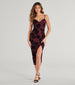 Bring the bold factor in a midi dress that features a floral flocked velvet print. a sleeveless sweetheart neckline with lace trim. adjustable spaghetti straps. bra cups for additional support. and a corset-like bodice supported with flexible boning. The fitted bodice leads to a midi-length silhouette accented with a high side slit. Complete your date night outfit with block heels.