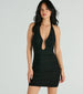 Boldy chic. this halter plunge rhinestone mesh mini dress is a sexy staple for your next GNO! Crafted with a stretchy sheer mesh fabric with a knit lining for coverage. this mini-length dress is accented with all-over mini rhinestone embellishments for that glam girl vibe. It features a sleeveless halter plunging V-neckline with a sultry U-wired design below the bust. and an open back with tie-back halter straps to find your perfect fit. The ruched silhouette will accentuate your gorgeous curves along the bodycon fit. Complete your night out look with metallic heels!