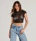 Take the spotlight in this sheer mesh crop top designed with short sleeves. a crew neckline. and rhinestone embellished stars along the front for a sparkly effect! Complete the look in jean shorts.