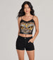 Add some edge to your casual 'fits with this trendy graphic tank top! Made with a cotton-blend fabric with moderate stretch. it is detailed with a sheer lace trim to add a feminine touch. The top features a sleeveless V-neckline. spaghetti straps. an eagle. motorcycle. flames. and chain-link graphic with the script. "Born To Ride. Los Angeles." and a fitted cropped hem. Style with denim shorts and ankle booties.