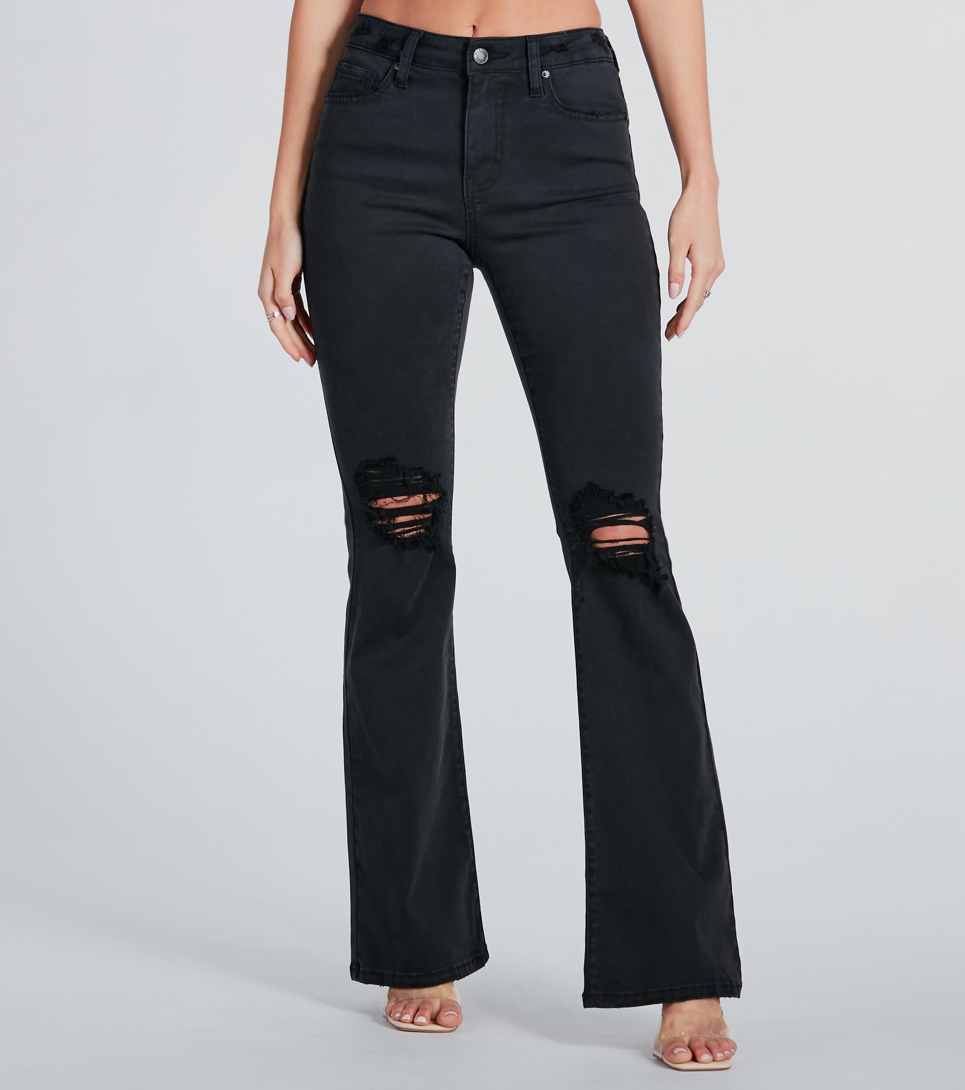 The Bri high-rise destructed flared jeans by Windsor Denim will step up your everyday casual 'fits for on-point looks! They feature a high-rise waist. trendy destructed detailing at the knees. and a flattering flared-leg hem. Include a front button closure and a five-pocket and belt loop design. Style these jeans with a crop top and clear heel mules!
