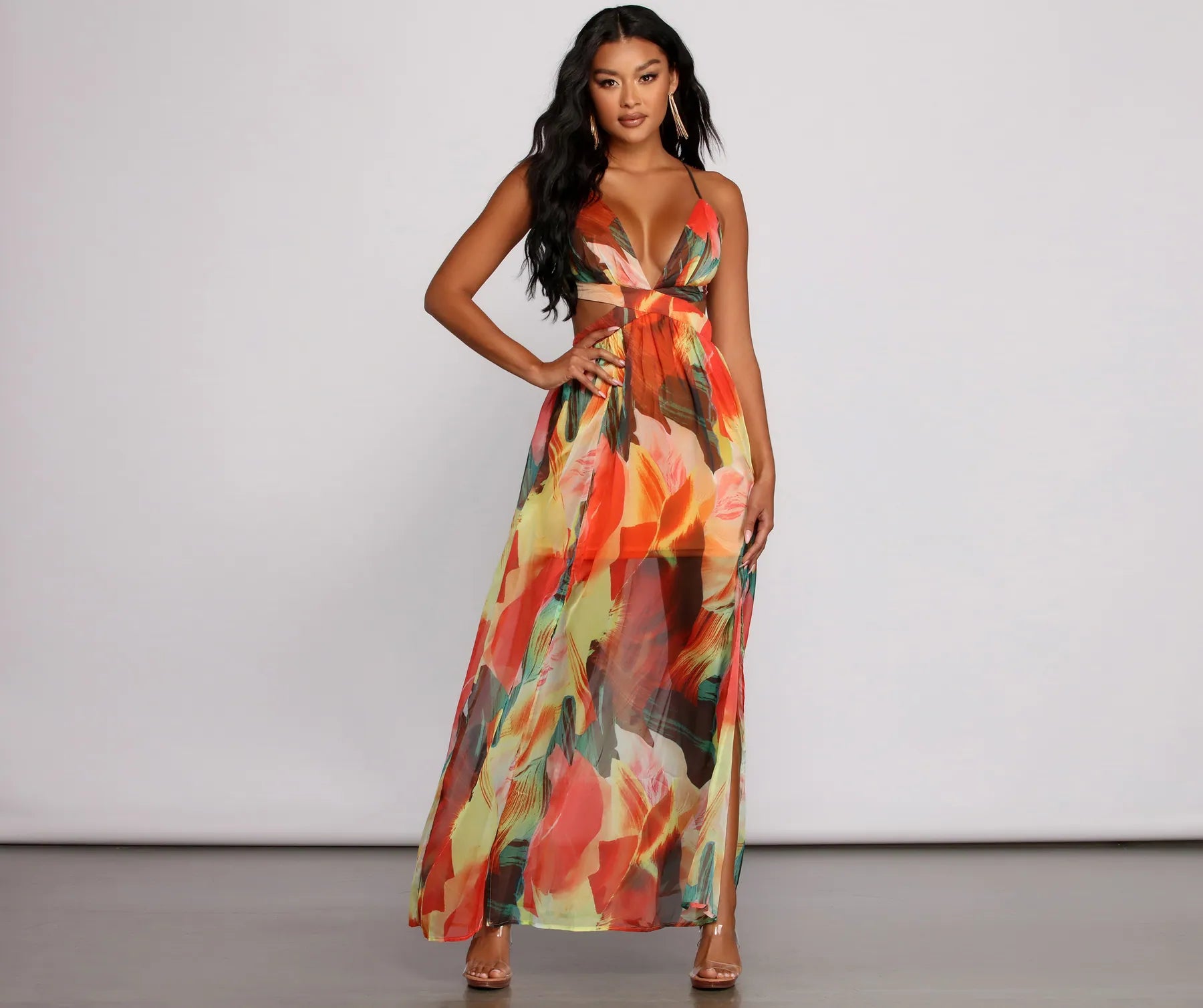 Bring on brighter vibes in this maxi dress that brings a burst of color this season. The maxi dress features a plunging v-neckline. sexy waist cutout to show off a hint of skin. a lace-up back. and a high side slit. Complete your look with fab cork wedges and sunnies for those ultimate summer vibes.Â