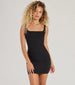 This sleeveless mini dress boasts a flattering square neckline with edgy faux leather adjustable belt buckle straps and a bodycon fit. Complete the look with booties.