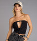 Bold and unapologetic—this tube crop top brings the drama with a belted neckline. crop fit. and edgy cutout detail. Perfect for pairing with shorts. denim. or a sleek mini skirt when you're feeling untamed.