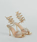 Wrapped in whimsical inspiration. these metallic stiletto heels are a major showstopper! Showcasing a square toe and rhinestone embellished toe and spiral ankle straps adorned with delicate butterfly decor. Complete the look with a clutch for a birthday party!