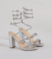 Add a whimsical mystique to your outfit with these statement metallic block heels perfect for dressy events! They feature an almond-shaped toe. a wide toe strap with mini rhinestone trim. and a spiral ankle rhinestone strap with butterfly accents. Complete the look with a ring set.