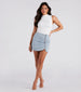 Look and feel like a total babe in this denim mini skirt- a must-have for your summer style! It features a flattering high-rise waist. front side snap button-down closures with pleating. a slit accent. and a bodycon silhouette. Complete the look in a basic bodysuit and sandals.
