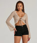 Head to the cabana in this stylish crochet crop sweater perfect for layering over your swimsuit! Featuring long sleeves with flare cuffs for added trendiness. dual tie-front closures. and a cropped hem that flaunts your figure. Complete the look with sunnies.