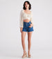 Create the illusion of a sleek and chic hourglass figure in the Cali shorts by Windsor denim! They feature a flattering high-rise asymmetrical cross waist and an on-trend raw cut-off hem on premium medium-wash denim with color fading. Complete the look in a breezy crop blouse for a beach date!