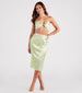 Answer the call of the wild in this fierce satin zebra printed skirt for a sultry vacay look! It features a high-rise waist. a hip-hugging fit. a midi-length hem with a back slit accent. and a fitted A-line silhouette. The sleek satin woven fabric features a trendy zebra print pattern. Style with the matching bandeau top.