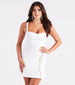 Everyone will be calling you sweet in this short A-line dress as the bride-to-be or graduate! It features a sleeveless sweetheart neck. tank shoulder straps. a ruched bust seam. a flattering A-line silhouette. asymmetrical front ruffle trim. and a short-length hem. Complete the look with earrings and block heels.