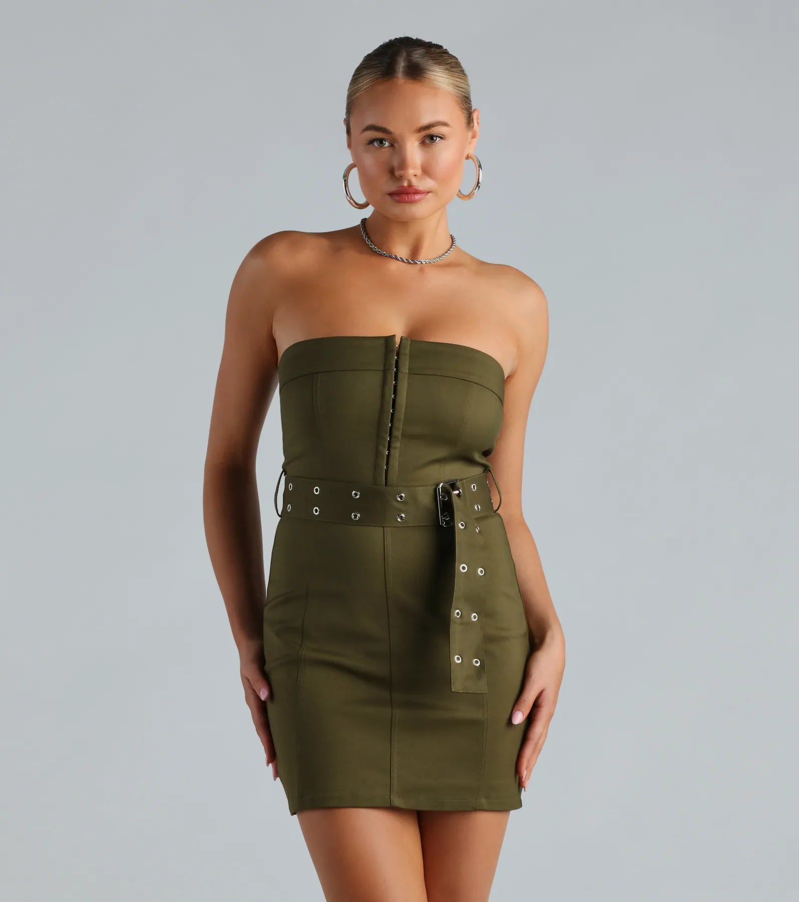 Capture all the attention in this alluring belted mini dress that will draw in all the compliments! It features a strapless straight-across neckline. front hook and eye closures at the bodice. a high waist seam with a belted design to cinch your silhouette. vertical seams running down the front and back. and a mini-length hem with a bodycon fit. The lined woven fabric has a minimal stretch. Style this edgy-chic dress with hoop earrings and ankle booties!