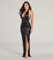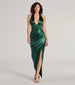 Steal the scene in this satin formal dress featuring a pleated halter neckline and a high front wrap slit. The silky satin fabric wraps your body in a slim silhouette and floor-length hem.