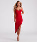Captivate the crowd in this crepe midi dress showcasing luxe details sure to impress! It features a sleeveless v-neckline. spaghetti straps. a bodycon silhouette. side ruched seam leading to the asymmetrical. side cutout hem with rhinestone trim. Style with hoop earrings and heels to complete the look!