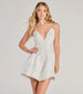 Capture the hearts of everyone you meet wearing this sleeveless skater dress to the school dance or as a chic bride-to-be! The plunging V-neckline and underwire bust enhance your curves. while adjustable spaghetti straps and a crisscross back provide a comfortable fit. The skater silhouette and short-length hem add a playful touch to this must-have dress. Complete the look with heels and earrings.