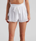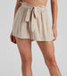 These lightweight woven shorts were made for those carefree summer days! They feature a high-rise paper bag waist. a cute tie-front belt. and chic pleated detailing. Style these shorts with a basic bodysuit and slip-on sandals.