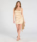 Create a flirty and fab party look in the Carlene formal mini dress designed with satin knit fabric to deliver that sleek sheen. It features a strapless straight neckline. all-over ruching to flaunt your stunning curves. a faux wrap-front design with a ruffled side sash accent. and a short bodycon silhouette.