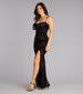 Built for your slow-motion entrance. the Carmen gown channels timeless glamour with a modern edge. Designed in flocked velvet that catches the light just right. its softly draped cowl neckline and ruched seams sculpt the figure. while the thigh-high slit adds that perfect after-dark allure.