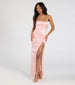 The long wrap dress features a stretchy satin-like fabrication. a sleeveless square neckline. adjustable spaghetti straps. a high-side slit accented with ruching. and a partially open back accented with a large bow accent. Complete formal outfit with a rhinestone clutch.