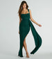 Strut like a confident sensation in the Carolyn cowl neck glitter formal dress with a train at banquets or weddings! The cowl neckline and slim silhouette effortlessly accentuate your figure. while the high front slit adds a touch of allure. The attached train and long-length hem elevate your look. all the while shimmering in sparkling glitter fabric. Compliment the look with earrings and a clutch!