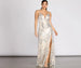 Show up to the party in dazzling fashion with our showstopping Carrie dress! She features a sleeveless plunging V-neckline. adjustable spaghetti straps for a customized fit. and a floor-sweeping hemline with an A-line silhouette and a chic front slit. The lined mesh fabric has stunning all-over sequin embroidery in a vintage-inspired scroll pattern. Complete the look with rhinestone duster earrings.