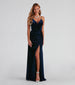 Make a luxe entrance with a formal dress that brings elegance to your special evening! Cassia features a sleeveless V-neckline with a built-in bust. bungee spaghetti straps. ruching. and an A-Line silhouette with a high-side slit. The back features an open-back design with a slide hook closure at the center and ruching at the lower back. The dress is composed of a velvet fabric that offers a moderate stretch. Complete look with rhinestone heels.