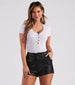 This casual classic henley bodysuit will be a new wardrobe staple! It features a V-neckline. a partial faux button-front design. short sleeves. a thong bottom with a dual snap-button closure. and a form-hugging fit. The ribbed knit fabric offers plenty of stretch. Style with high-rise denim and your fave mules.