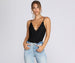 Wardrobe staples get a boost when it comes to crochet! Take this embellished and trimmed black bodysuit. which features all-over ribbing. spaghetti straps. a deep V. a thong-style bottom. and two-button snap closure. Bodysuit is made from a soft brushed knit with a fair amount of stretch.