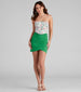 Keep it casual with a mini skirt that is perf for pairing with a casual tee or dressy blouse. The skirt features an elastic high-rise waist. a wrap design. and a mini-length hem. The skirt is composed of a lined brushed knit fabric that offers a form-hugging fit with a moderate stretch.Â