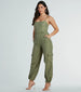 This sleek nylon cargo jumpsuit is essential for your next casual getaway! Designed with a lightweight smooth nylon-blend fabric. it features a square neckline with adjustable spaghetti straps for a customized fit. The high waist is detailed with belt loops and a faux button accent. leading to multiple pockets down the leg for a trendy design. The hem features adjustable drawcords to create a cinched jogger silhouette. Style this jumpsuit with strappy sandals.