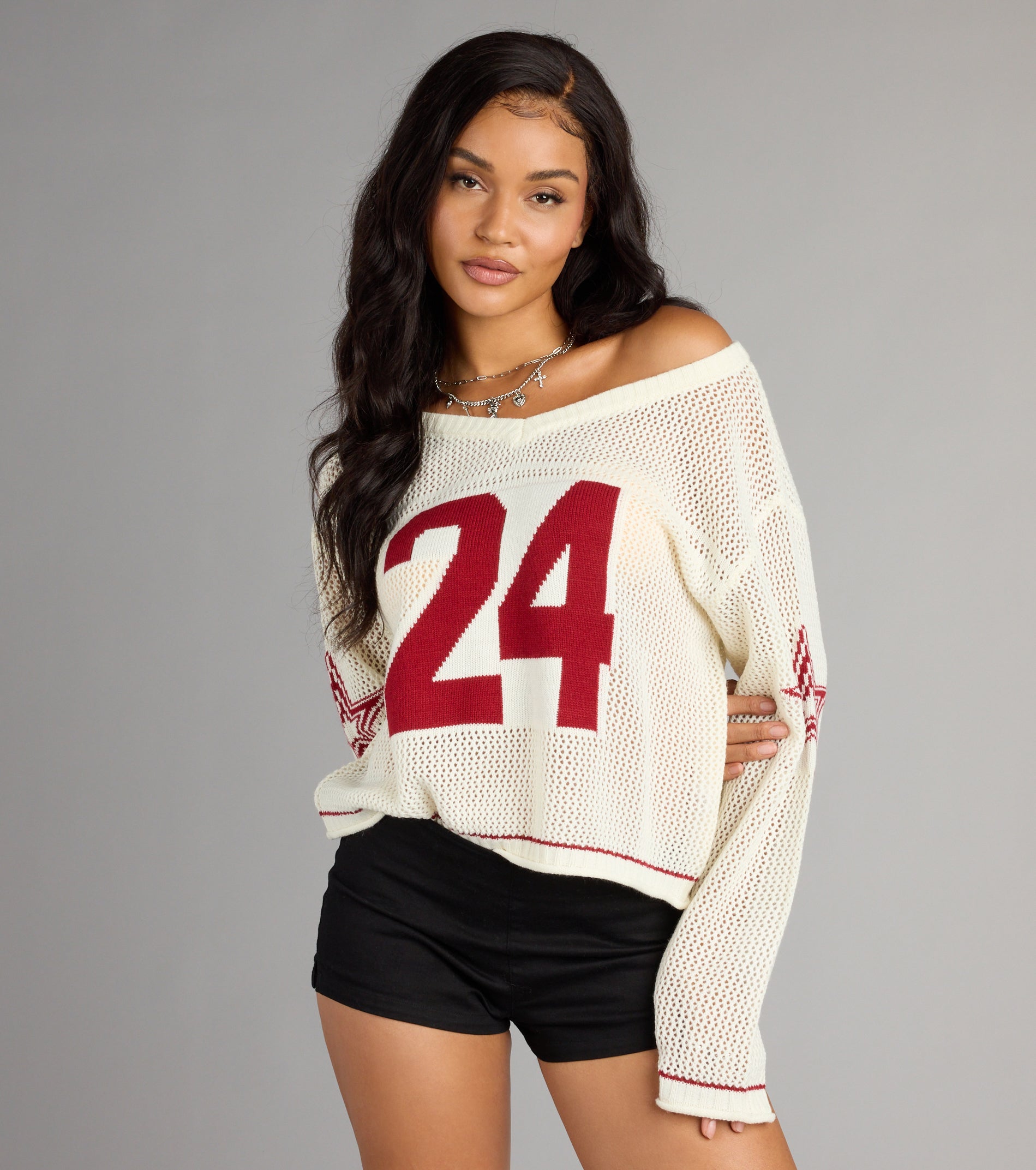 This knit sweater is sporty. slouchy. and oh-so-cute. Toss it on with mini skirts or biker shorts for a laid-back yet put-together look on off-duty days or casual hangs.