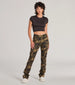 These camouflage twill pants feature a high-rise waist paired with a trendy bootcut silhouette. accented with cargo flap pockets for added edge. Style with a crop top and sneakers for a casual vibe.
