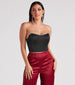 A cause for this rhinestone trim bustier is pop-the-bottle worthy! It features a strapless neckline. flexible boning inserts. and back hook-eye closures. composed of satin woven fabric. Complete the look in wide-leg pants for a night out.