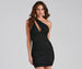 All eyes will be on you in this alluring crepe cutout mini dress featuring a sultry. one-shoulder neckline with a bust cutout. corset-style bodice. ruched bodycon silhouette. and a back zipper closure. Complete the look in statement rhinestone earrings.