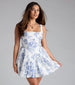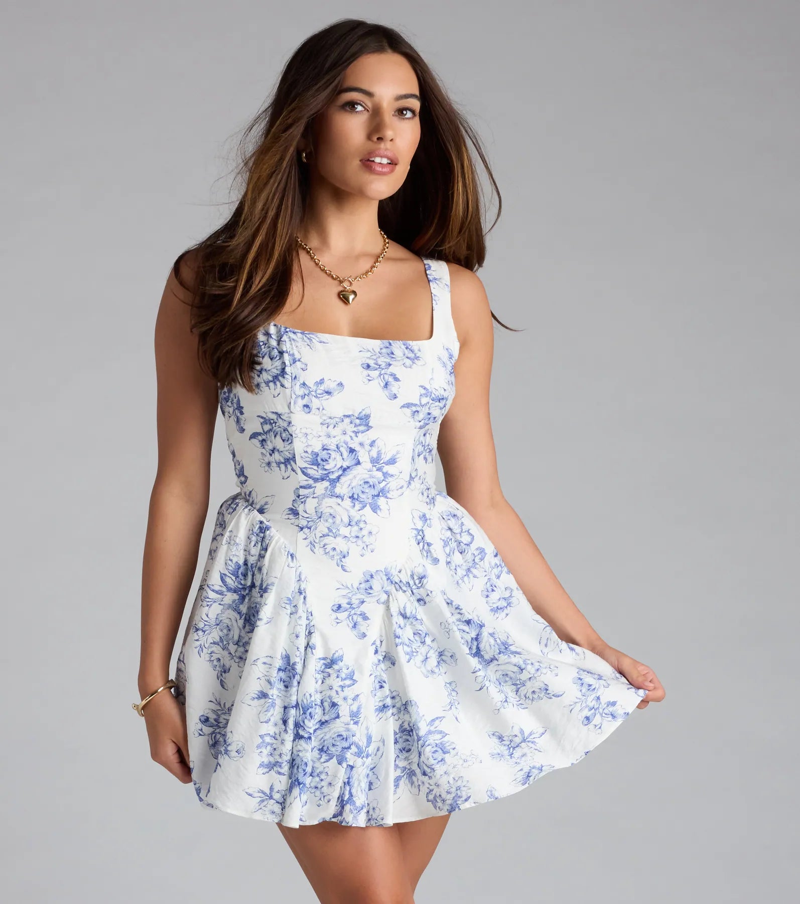 Create a charming impression in the sweetest floral skater dress featuring a tie-back design. V-shaped drop waist. and a short A-line silhouette. Style with mules for a garden party!