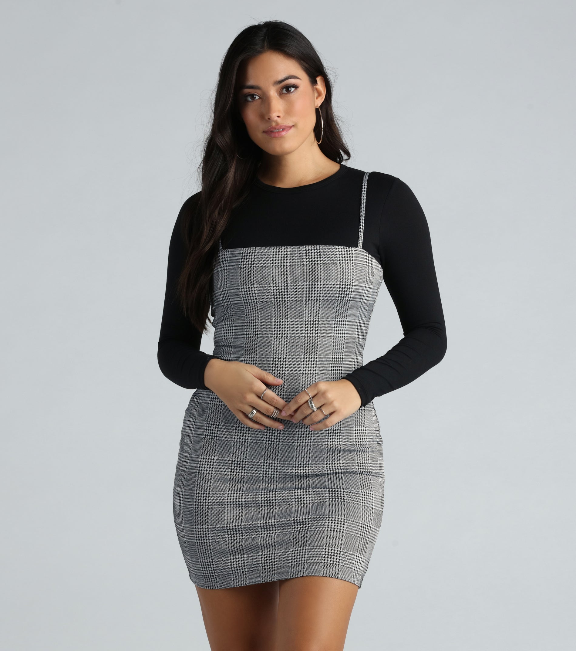 Make a statement in this gingham plaid mini dress! The square neckline and spaghetti straps make it the perfect dress for flaunting your curves. while the bodycon silhouette and mini-length hem radiate confidence. Complete the look by layering a long sleeve top for a preppy vibe!