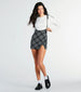 Check this plaid mini skirt into your weekly lineup! Featuring a mid-rise waist with suspender straps with tie closure. a bodycon silhouette. and a flirty slit along the hem. Style with a basic tee and boots for a cute complete look!