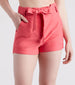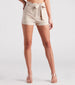 Chic and polished. these woven paperbag shorts will elevate your casual looks! They feature a high-rise paperbag waist with small slit accents at the front. a tie-front belt. front pockets. a cuffed hem. and a fitted silhouette. The smooth twill fabric offers a lightweight feel. Style with a crop top and denim jacket.