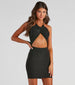 Keep your night out look chic and sultry with this bold LBD. The mini dress features a sleeveless halter neckline with a chunky gold chain-link strap. a wrap-front design at the bust with a major front cutout at the waist. and a short. curve-hugging silhouette. Style with sleek hoops and strappy heels.