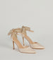 Showcase a chic attitude in these bow-detail stiletto pumps! They feature a closed pointed toe. a thin adjustable ankle strap. a closed back with an adorable rhinestone-embellished tulle bow accent. and a sleek stiletto heel. The pumps are composed of a smooth satin material with a faux leather subtle cushioned insole. Style with an envelope clutch for a dressy dinner date!