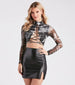 Amp up your night-out vibe with this chic cityscape-printed crop top! It features a mock neckline. long fitted sleeves. a sultry front lace-up design across the bust leading to the hem. and a cropped. form-hugging fit. The sheer mesh fabric features an all-over abstract cityscape-printed pattern for a cool and trendy look. Style with a faux leather skirt and stiletto heels.