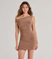 Serve iconic chic looks in this smooth knit mini dress featuring an asymmetric off-shoulder neckline with a short sleeve and a tank strap. The ruched detailing will highlight your stunning curves on the short bodycon silhouette.