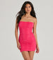 Enter looking like chic in this mesh mini dress for a night on the town! The dress is crafted from a textured mesh fabric designed in a strapless and bodycon silhouette complete with a sassy cutout back and mini-length hem. Style this dress with statement earrings.