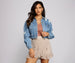 Create a chic moment with a denim jacket that is perf for layering over your maxi dresses. The jacket features a collared neckline. a multi-button down front. moderate distressing. chest pockets. long sleeves. and a stretchy cropped hem. The jacket is composed of a denim fabric that offers a relaxed fit with slight stretch.