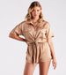 Make your next party a chic occasion in this silky sleek satin romper! It features a collared neckline. short sleeves. a button-down front. buttoned chest pockets. a cinched waist with a faux tie-front design. front pockets. and relaxed-fitting shorts. The smooth satin woven fabric gives off a stunning sheen to amp up the chic factor. Style with a chunky chain-link necklace and clear mules.