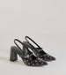 Chic and trendy will be your fall vibe in these faux leather pumps featuring a closed pointed toe with sleek studded accents. an adjustable strap across the foot. a sling-back strap. and a block heel. Pair with hoop earrings.