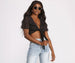 Keep it casual in tie front top. Step out in a casually cute top that features a plunging tie front bodice. unlined chiffon cap sleeves. and a cropped hem. The top is composed of a lightweight woven fabric that offers a relaxed fit with slight stretch. Complete your look with high waist jeans and mini crossbody.