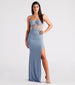 Stroll in looking majorly extravagant in the Chrissy formal dress at school dances. banquets. or celebrations! She features a sleeveless and sheer corset bodice with rhinestones. adjustable spaghetti straps. a padded bust. and flexible boning inserts. Her slim silhouette offers a form-hugging fit and a high side slit to show some skin along the floor-length hem. The formal dress is composed of a crepe fabric. Complete the look with a teardrop necklace.