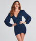 Shine bright in this stunning glitter mini dress! Featuring long peasant sleeves. a plunge V-neckline. a flirty cut-out back and tie closure. ruched seams and bodycon silhouette. and a mini-length hem. you'll look and feel chic. glamorous. and confident. Complete the look with a clutch purse for a cocktail party or event!