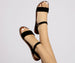 Bring the classic vibes to your summer look with these chic strappy sandals. They feature an open round toe. a thick toe strap. an adjustable ankle strap. and a cool metallic detailed edge. Complete the outfit with a must-have crossbody purse.